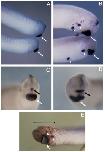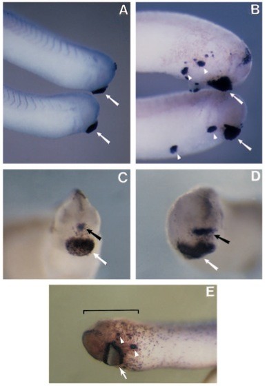 Fig. 4. Injection of X-bhh mRNA induces enlarged and ectopic anterior ectodermal and neural structures. Embryos at the two cell stage were injected with synthetic lacZ (A,C) or X-bhh mRNA and the resulting tadpoles were subjected to whole-mount in situ hybridization with probes for the XAG-1 cement gland marker (A,B) and the XANF-2 anteriorpituitary gland marker (C,D) (see Materials and methods). lacZ-injected embryos display wild-type patterns of XAG-1 (A) and XANF-2 (C) expression; X-bhh-injected embryos, in contrast, display enlarged (white arrows in B and D) and ectopic (arrowheads in B) cement glands and an expanded region of labeling with the anteriorpituitary marker (compare dark arrows in C and D). Normal and expanded cement glands in panels C and D (white arrows) are visible due to natural pigmentation. (E) Embryos co- injected with lacZ and X-bhh RNAs into both dorsal tier one cells of the 32 cell embryo develop with foci of XAG-1 expression (arrowheads) in only a subset of cells expressing β-galactosidase (red-brown stained cells beneath the bracket).