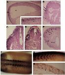 Fig. 3. Expression of X-bhh in mesoderm and ectodermal derivatives. Whole embryos, hybridized in situ with a probe specific for X-bhh transcripts, were embedded in paraffin and sectioned (see Materials and methods). (A) Sagittal section of a stage 14 neurula with anterior to the left. X-bhh transcripts are most prominent in the sub-epithelial and epithelial layers of the neuroectoderm but are also present at lower levels in the underlying chordamesoderm (see arrows in the insert), (np) neural plate, (a) archenteron. (B) Parasagittal section through the head of a stage 28 tailbudembryo with anterior to the left. X-bhh-expressing cells are seen in the sub-epithelial layer of the ectoderm (arrows), just dorsal to the cement gland (cg); (e) eye. (C) Transverse section of a stage 28 embryo at the level of the eye (e). X-bhh expression is found in both the superficial and deep layers throughout the roof of the mesencephalon (me). Expression is also observed prominently in the prospective retinal layer of the eye vesicle (e). (D) Transverse section of a stage 28 embryo at the level of the otic vesicle (ov). X-bhh expression is seen in the dorsal roof of the rhombencephalon (rh), and in the epithelial layer of the ectoderm. Expression is also prominent in the otic vesicle (ov), (n), notochord. (E) Para-sagittal section through the head of a stage 28 embryo with anterior to the left. X- bhh transcripts are detected in the dorsal mesencephalon and rhombencephalon (arrows) and in the branchial arches (arrowheads). (F) Dorsal view of a whole tailbudembryo (stage 23) with anterior to the left. The embryo has been double-labeled by in situ hybridization with a probe specific for X-bhh transcripts prior to immunostaining with monoclonal antibody 12/101, specific for the myotomal portion of the somite (Kintner and Brockes, 1984). A block of two adjacent somites (s) is delimited by the arrows. (G) Lateral view of the embryo in F, at higher magnification, and with anterior to the left. The brown 12/101 stain highlights the myotome of each somite (area between two arrows); the dark blue X-bhh stain is localized to a single central portion of the dermatome of each somite (see text; data not shown). (H) Glancing section in the plane of the dermatome of an embryo similar to that in F with anterior to the left. The arrows demarcate the boundaries of a single somite and the arrowhead denotes X-bhh staining.