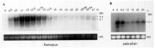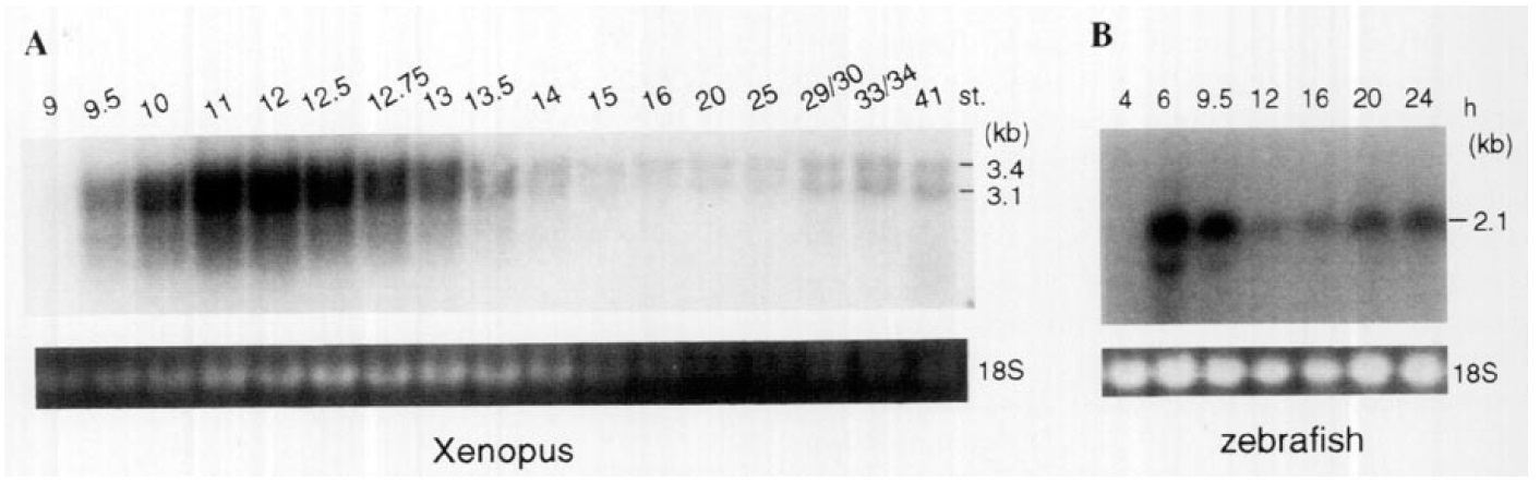 Northern blotting. Two major transcripts of 3.4 and 3.1 kb were detected in Xenopus (A), and a 2.1-kb transcript was detected in the zebrafish