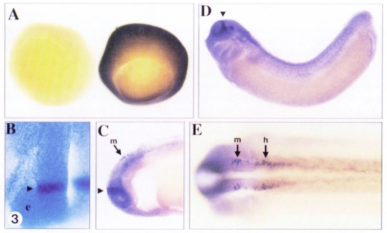FIC. 3. Expression of Xlim-5 mRNA in Xenopus embryos as revealed by whole-mount in situ hybridization. (A) Stage 11; left, sense probe; right, antisense probe. (B) Stage 20, head region, anterodorsal view. (C) Stage 25. anterior region, lateral view. (D) Stage 81, lateral view. (E) Stage 31, dorsal view. The forebrain signal is marked by a filled triangle. Arrows indicate signal in midbrain (m) and hindbrain (h). Eye vesicle (e).