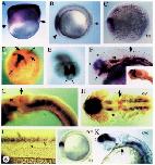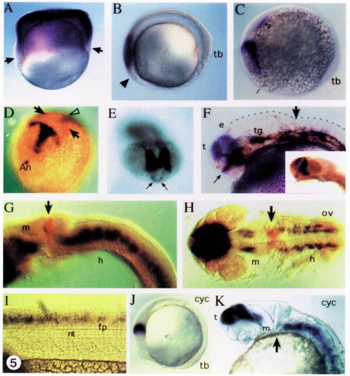 spinal cord staining. (J and K) Cyclop.~ mutant ~;mbryos. (J) Five-somite stage. By comparing to C it is apparent that the anterior-ventral
