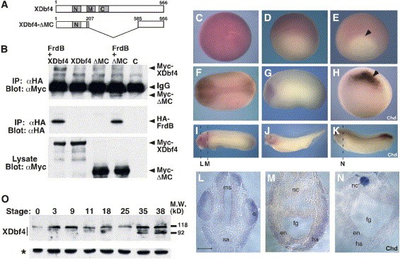 Figure 1. XDbf4 Associates with Frodo and Is Expressed throughout Xenopus Development(A) Diagram of XDbf4 and XDbf4-δMC with amino acid numbers indicated. Domains N, M, and C conserved between XDbf4 and yeast Dbf4 are shown.(B) XDbf4 and XDbf4-δMC coimmunoprecipitate with Frodo. Lysates of embryos injected with Myc-tagged XDbf4 or XDbf4-δMC (δMC) and HA-tagged FrdB mRNA were precipitated with anti-HA antibody as indicated. Top panel, Myc-XDbf4 and Myc-δMC coprecipitated with FrdB was detected with anti-Myc antibodies; middle panel, precipitated HA-FrdB detected with anti-HA antibodies; bottom panel, Myc-XDbf4 and Myc-δMC detected with anti-Myc antibodies in whole lysates. C, uninjected control embryos.(CâN) In situ hybridization analysis of XDbf4 expression. (CâG, I, and J) XDbf4 antisense probe. (H and K) Chordin antisense probe as a specificity control. (C) Stage 9, animal pole view. (D) Stage 9, lateral view. (E) Stage 10.5, gastrula, dorsal view. (F) Stage 20, late neurula, dorsal view. (G) Stage 22, lateral view. (H) Stage 10, vegetal view. (E and H) Arrowheads point to dorsal lip. (I and K) Stage 26. (J) Stage 35/36. (F, G, and IâK) Anterior is to the left. (L, M, and N) Sections from the regions indicated in (I) and (K); dorsal is up. ha, heart anlage; e, eye vesicle; en, endodermal yolk mass; sa, stomodeal anlage; ms, mesencephalon; fg, foregut; nc, notochord. Bar in L, 200 μm, also corresponds to M and N.(O) Developmental expression of XDbf4 protein. Western analysis of embryo lysates with anti-XDbf4 antibodies was carried out at indicated stages. A vertical bar indicates multiple phosphorylation states of XDbf4; asterisk, a nonspecific protein band reflects loading; M.W., molecular weight markers.