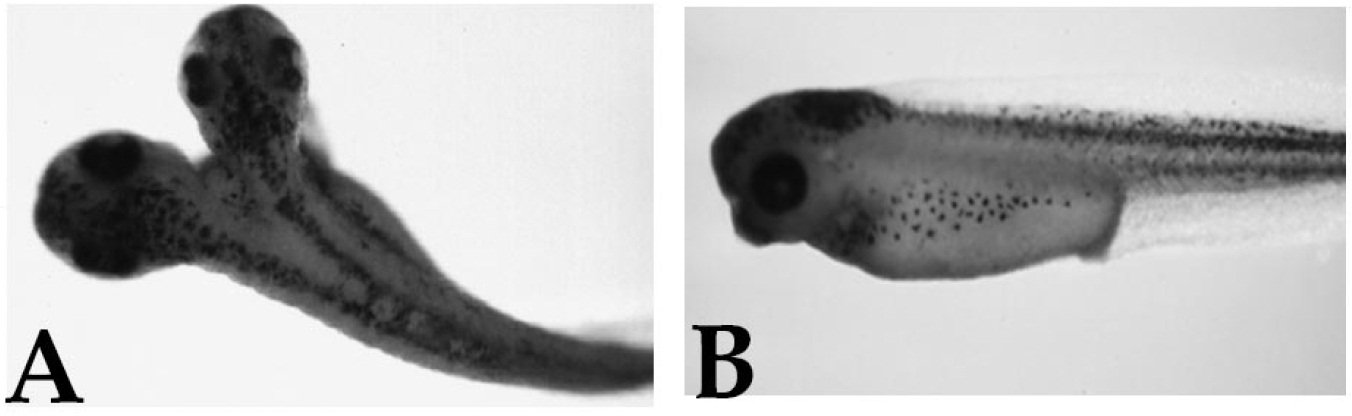 secondary dorsal axis. Approximately 10 pg of Xwnt-8b RNA was injected near the marginal zone into ventral (A) or dorsal (B) blastomeres of
