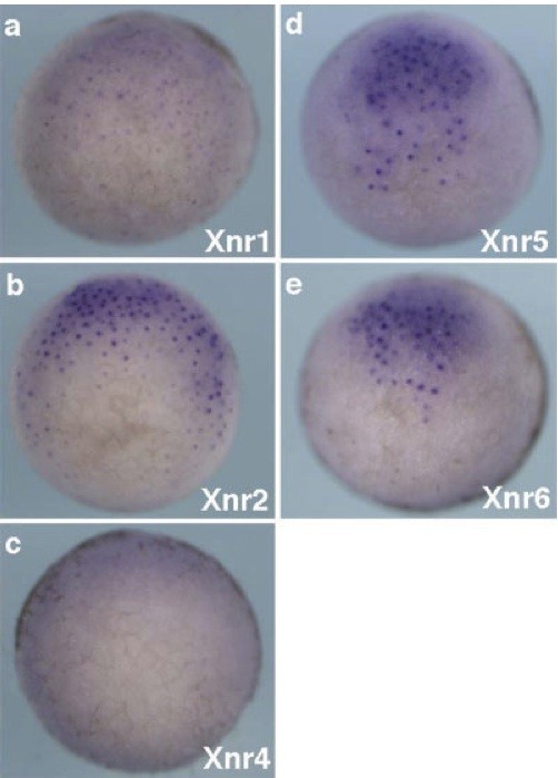 In Xenopus, six nodal-related genes (Xnrs) have been identified to date. We found numerous tandem duplications of Xnr5 in the Xenopus laevis and Xenopus tropicalis genomes that involve highly conserved copies of coding and regulatory regions. The duplicated versions of Xnr5 were expressed in both the superficial and deep layer of dorsal endoderm and in the deep layer of ventral endoderm, where the initial inducers of mesendoderm formation would be expected to be localized. Overexpression of secreted inhibitors of Xnrs led to a substantially enhanced transcription of the duplicated Xnr5 genes and Xnr6 in embryos. Therefore, Xnr5 and Xnr6 have a novel feedback loop to inhibit transcription of Xnr5 and Xnr6. These results suggest that the initialization of a strong Xnr5 and Xnr6 signal is enabled by the rapid transcription from multiple genes. The novel feedback loop may negatively regulate transcription of Xnr5s and Xnr6 to limit overproduction of these potent inducers, with the Xnr5/Xnr6 signal then activating positive (Xnrs) and negative (Xlefty) loops, which regulate the range of mesodermal tissues produced.