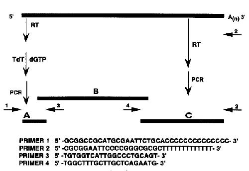 a tadpole eDNA library. Fragmeats A and C were isolated by anchored PCR. The numbered arrows indicate the primers used. RT, reverse transcriptase;