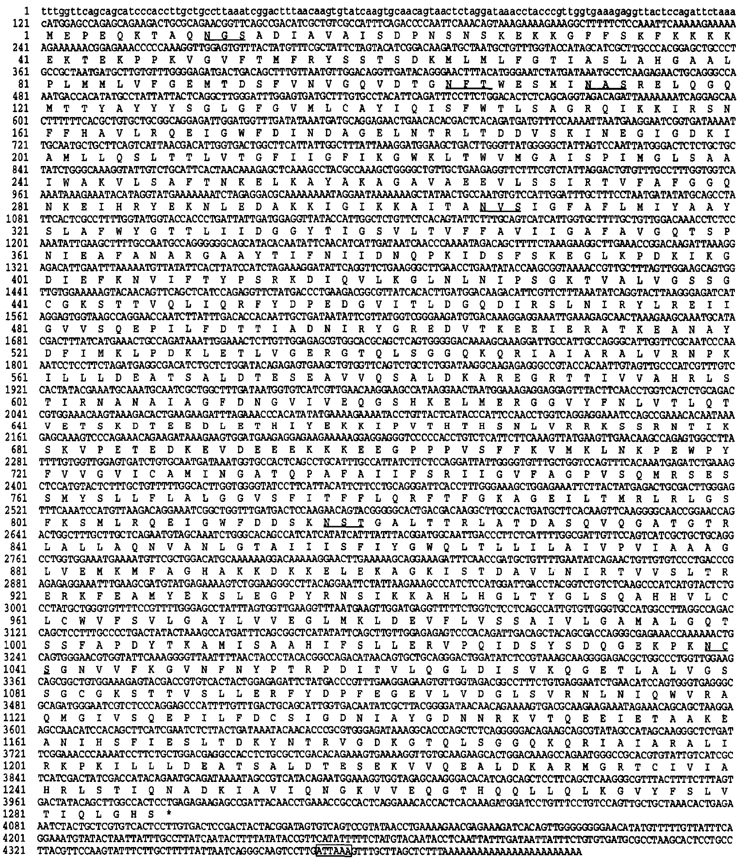 frame AT(]. Putative N-glycosylation sites are underlined and the polyadenylation signal is boxed.