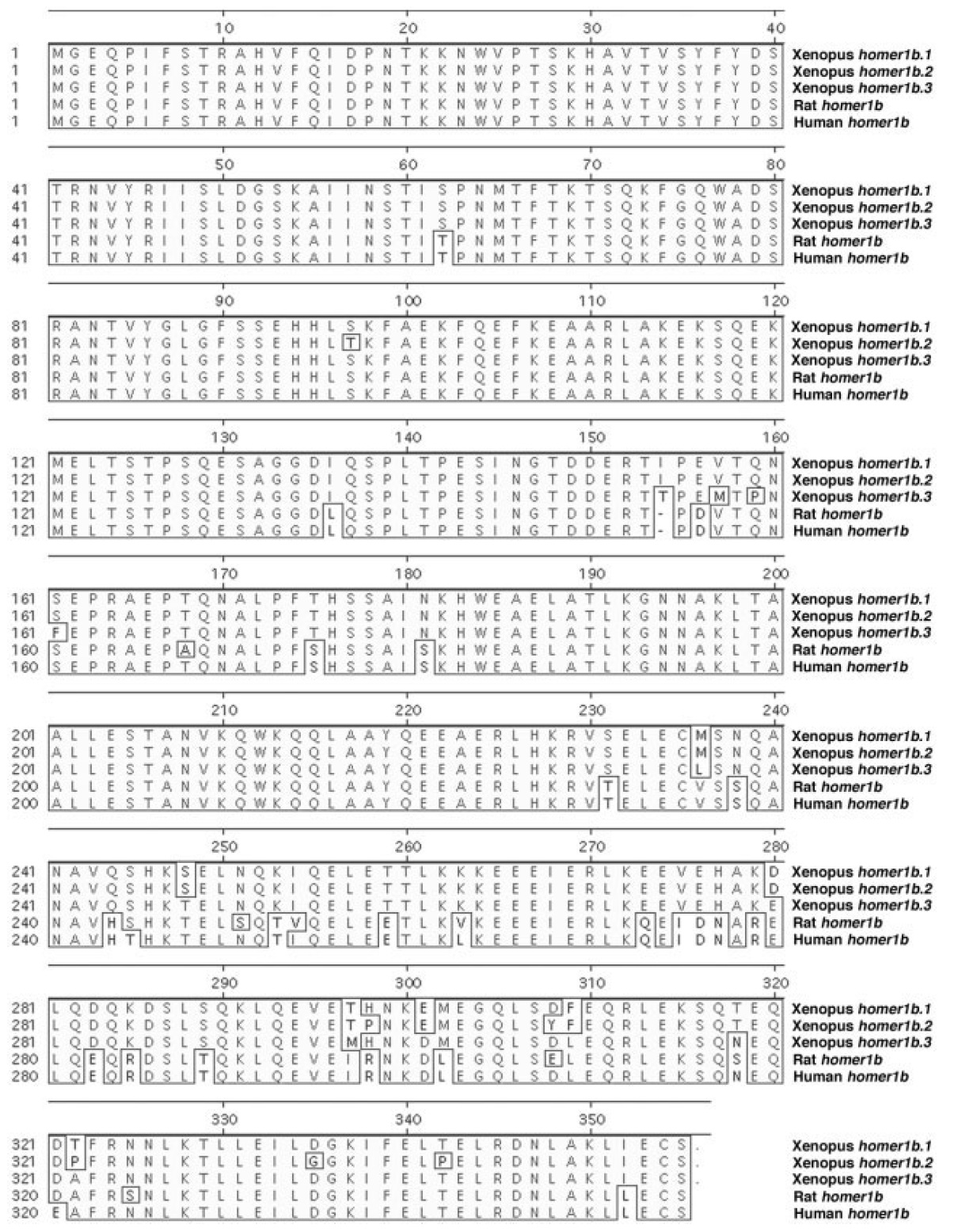 Fig. 1. Xenopus homer1b isoforms are highly homologous to rat and human isoforms. The open