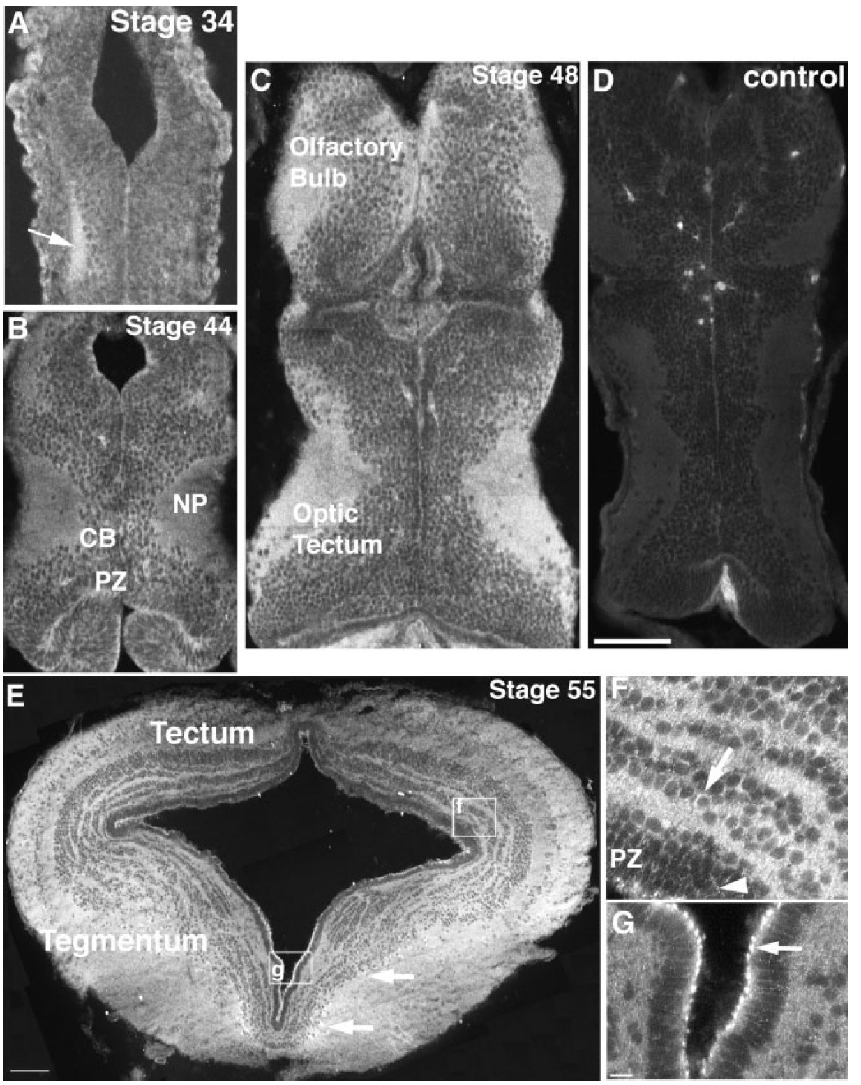 Xenopus brain. A: Homer1b was first detected at stage 34 in