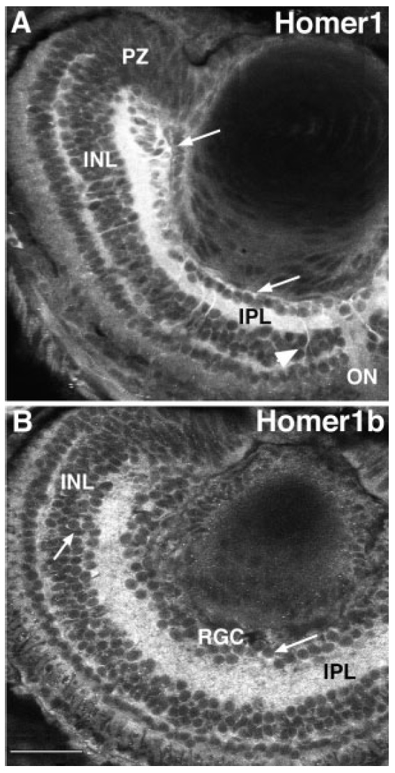 retina, Homer1-IR appears strongest within the inner plexiform layer