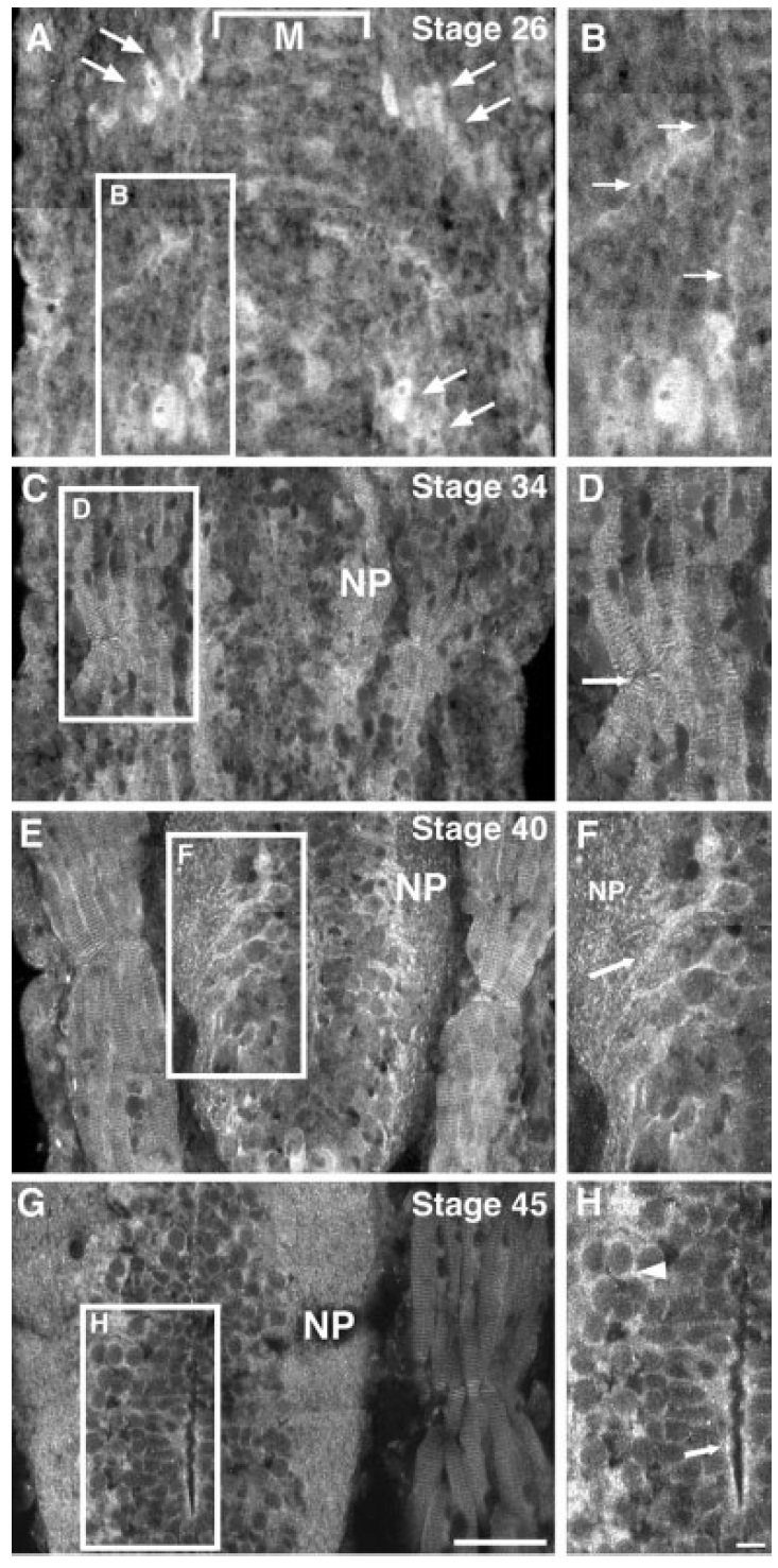 myotome junctions (arrow). E: By stage 40, cytoplasmic localization of