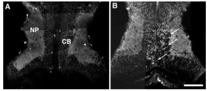 evident within cell body (CB) and neuropil (NP) regions throughout