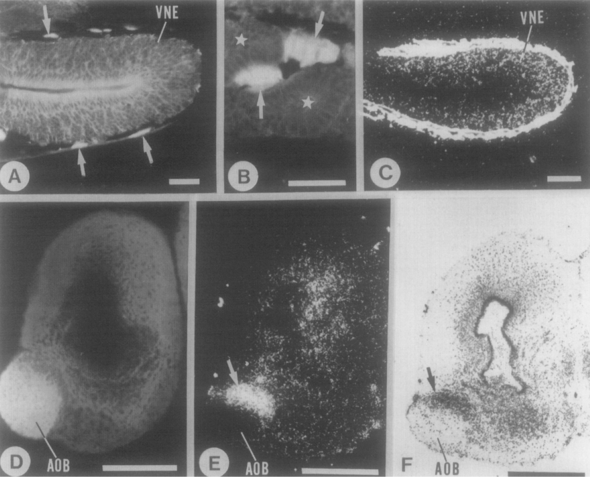 (VNE in [A]), the vomeronasal nerve fibers (arrows in [A] and [B]), and the neuropileof the accessory olfactory bulb (AOB in [D]) are positively stained with MAbB2.