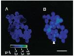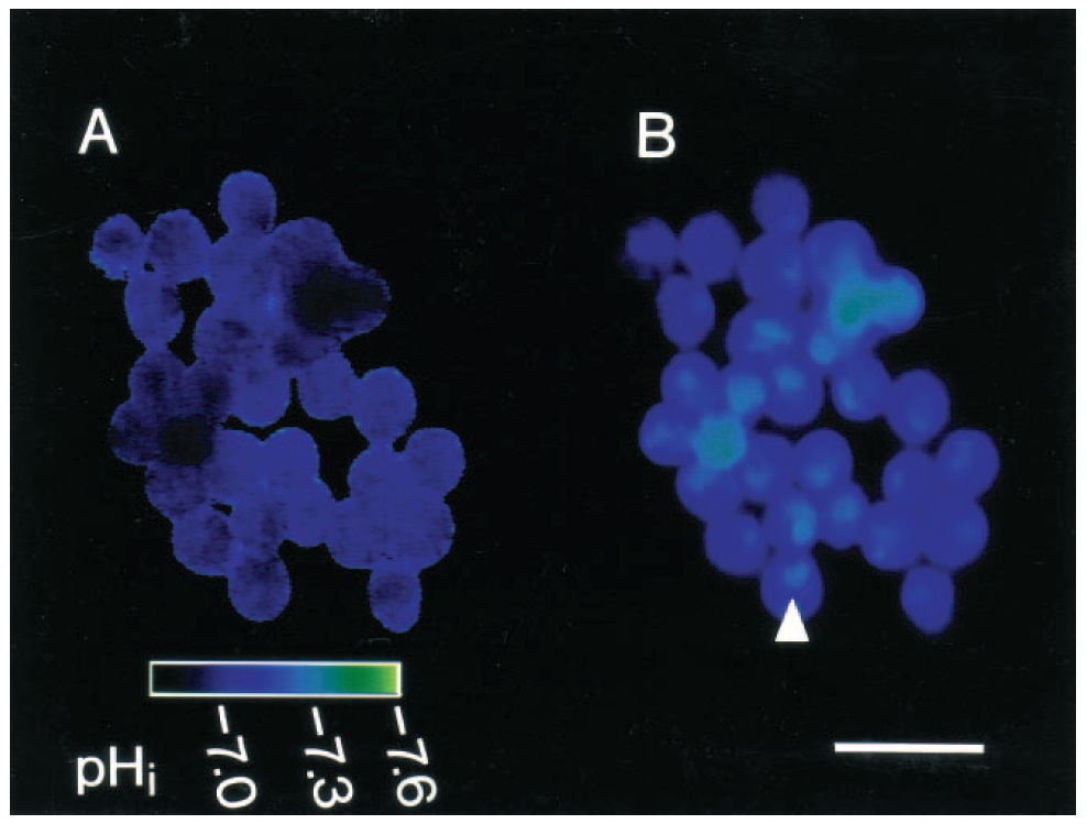 green pH 7.7, blue pH 7.3. Note that nuclei