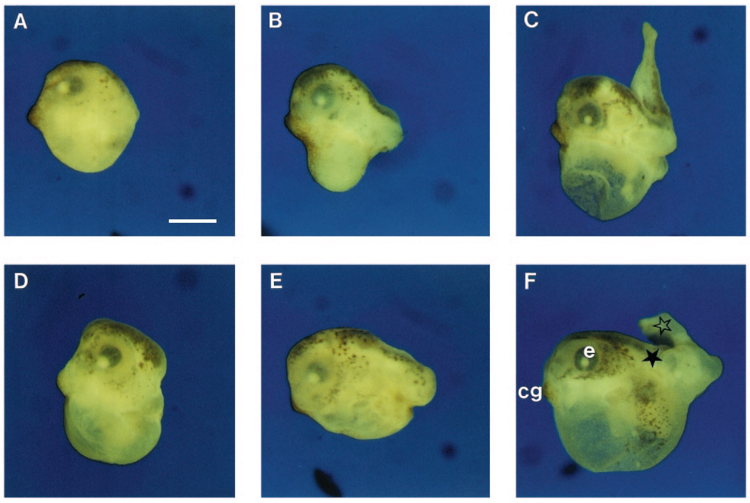 FCCP). (F) Complete axial development (pHo 6.8 with FCCP). e, eye; cg, cement gland; solid asterisk, trunk; open asterisk, tail. Scale bar:
