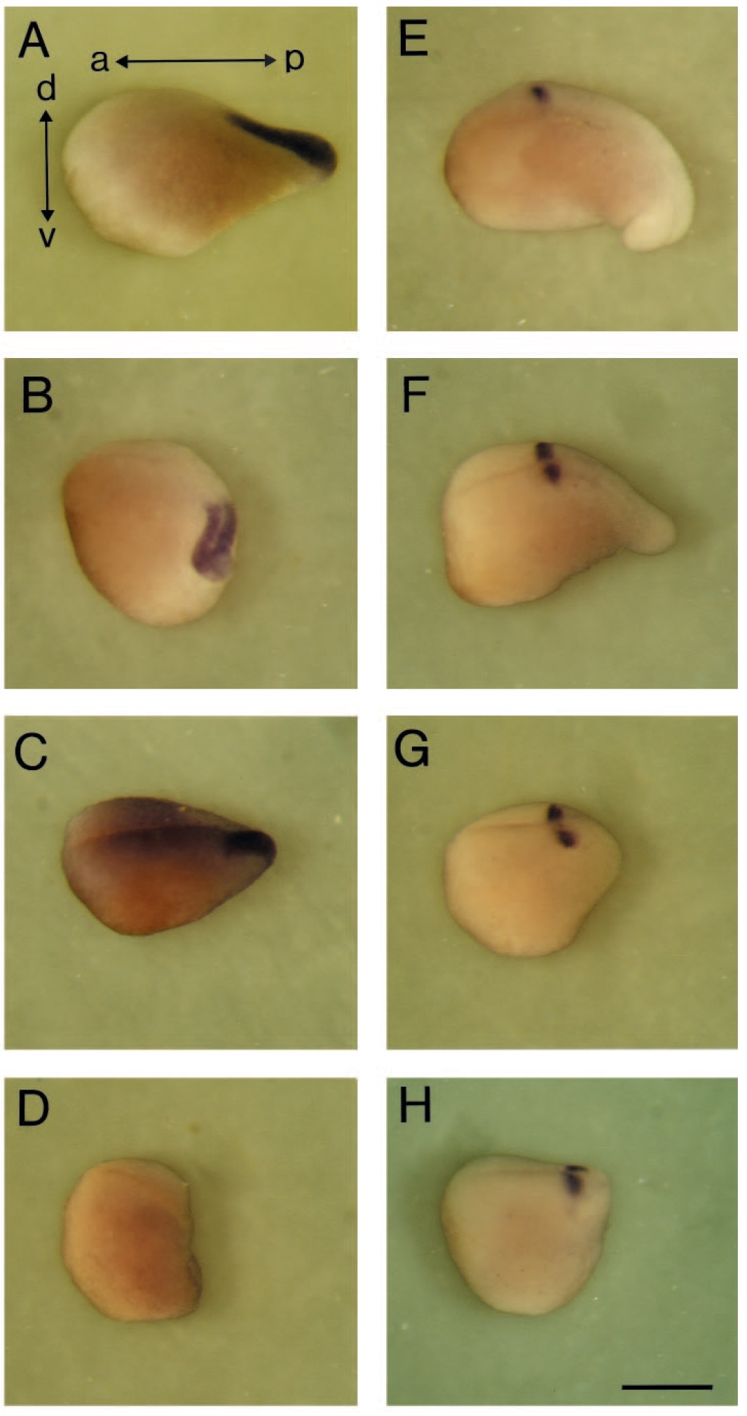 posterior; d, dorsal; v, ventral. (A-D)
