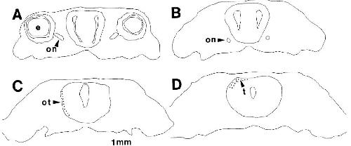transversely through the head. A, Section at the level of the proximal optic nerve (on) near its exit from the eye (e). B, Section illustrating the