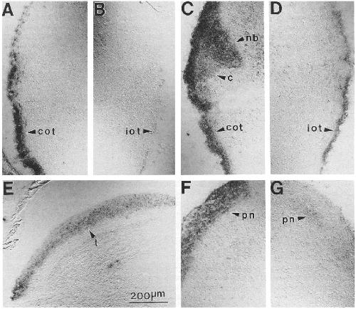 These views are from sections located slightly rostra1 to those shown in Figure 1D and panel E. Scale bar in E is for all panels.