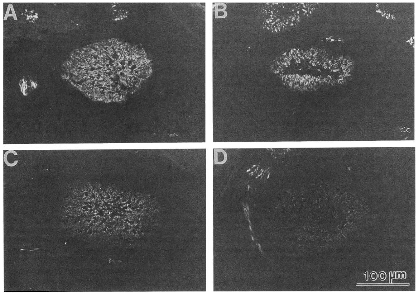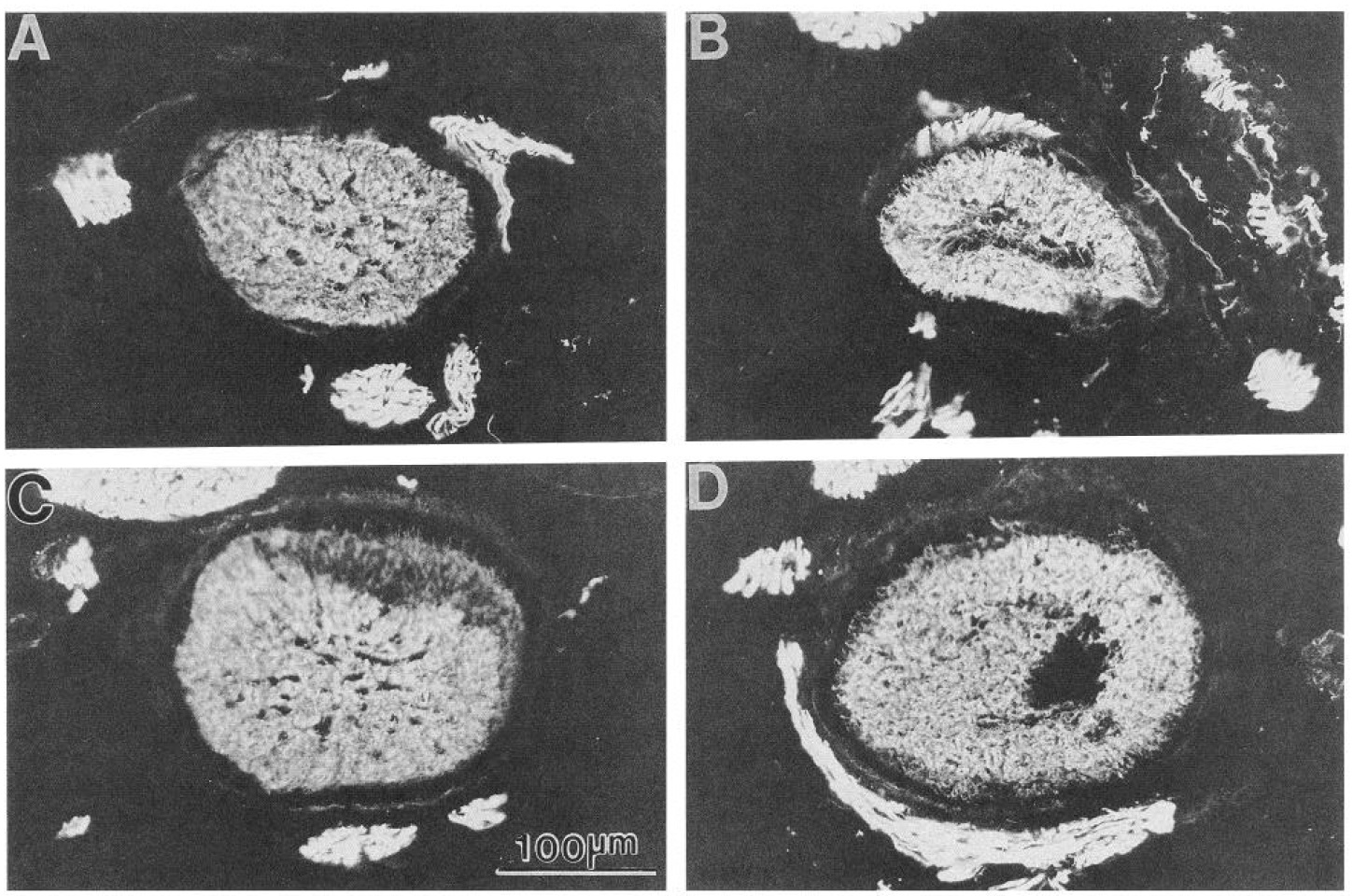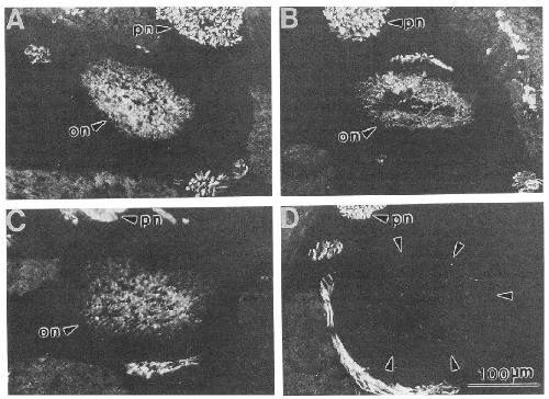 Figure Il. Regenerating, crushed optic nerves (on) from a sham operated control (A and C) and a tectal ablated (B and D) frog, 6 weeks after