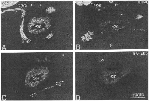 antibody to NF-M/P (H053). A and C, and B and D represent two pairs of serial sections, respectively. The arrowheads labeled pn point to adjacent