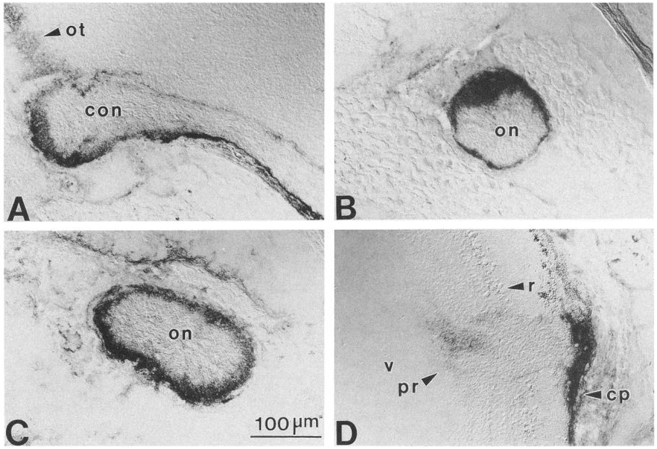optics. In all panels, lateral is to the left; dorsal is up. A, Labeled retinoretinal axons coursing through the contralateral chiasmatic optic nerve (con)