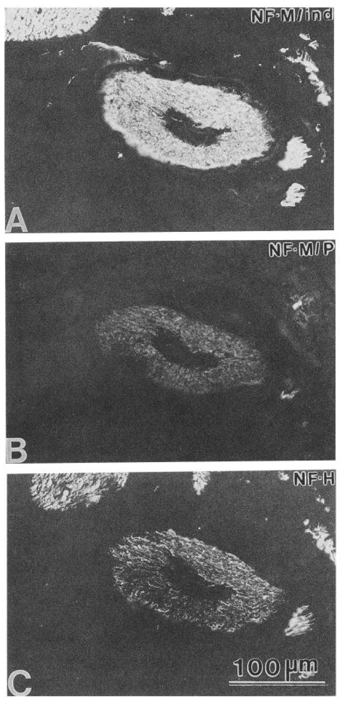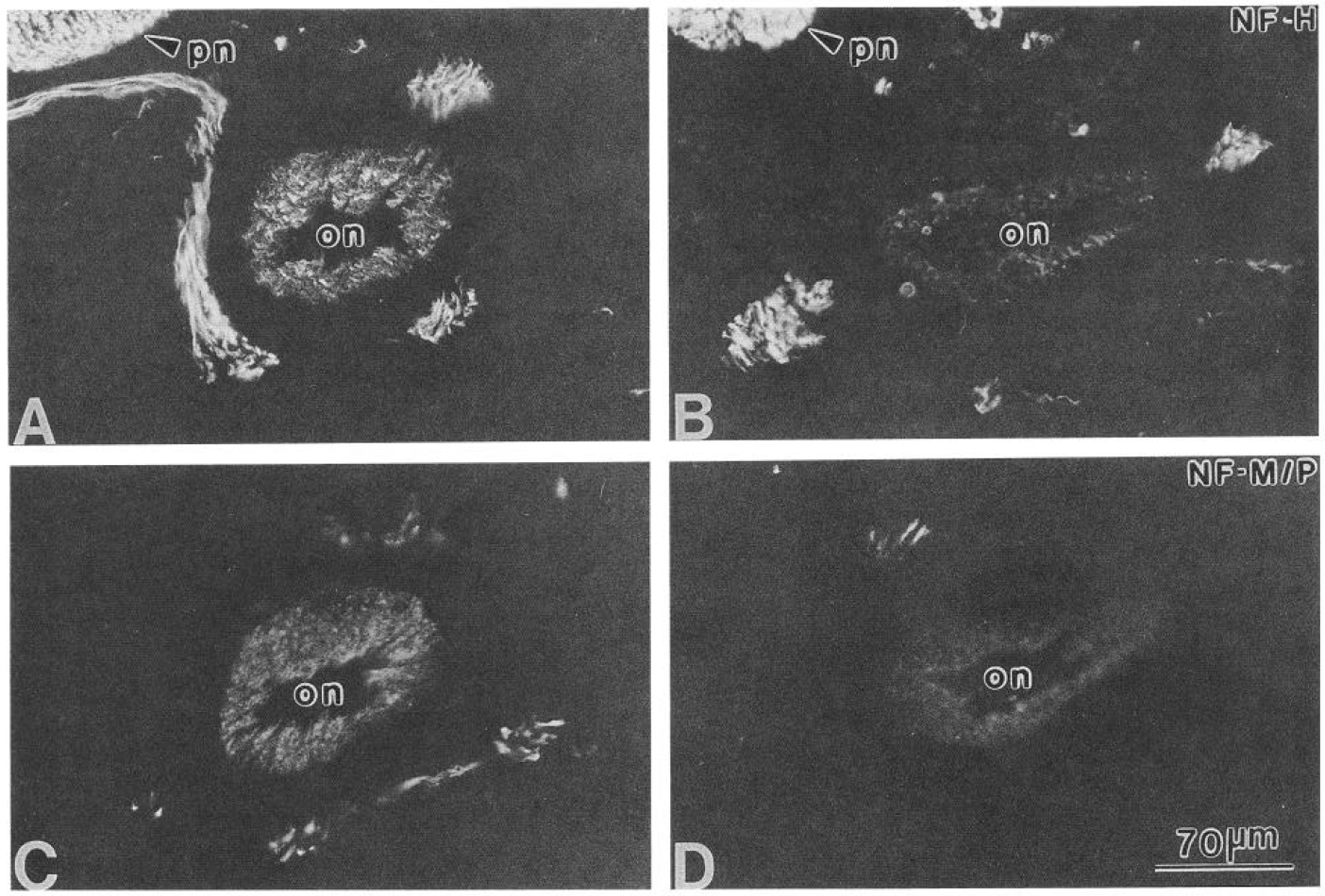 optic nerve, visualized with Nomarski optics. B, The section adjacent to A, stained with the antibody (XC10C6) directed against NF-M/ind and