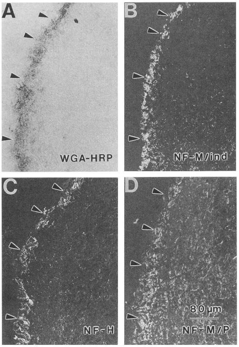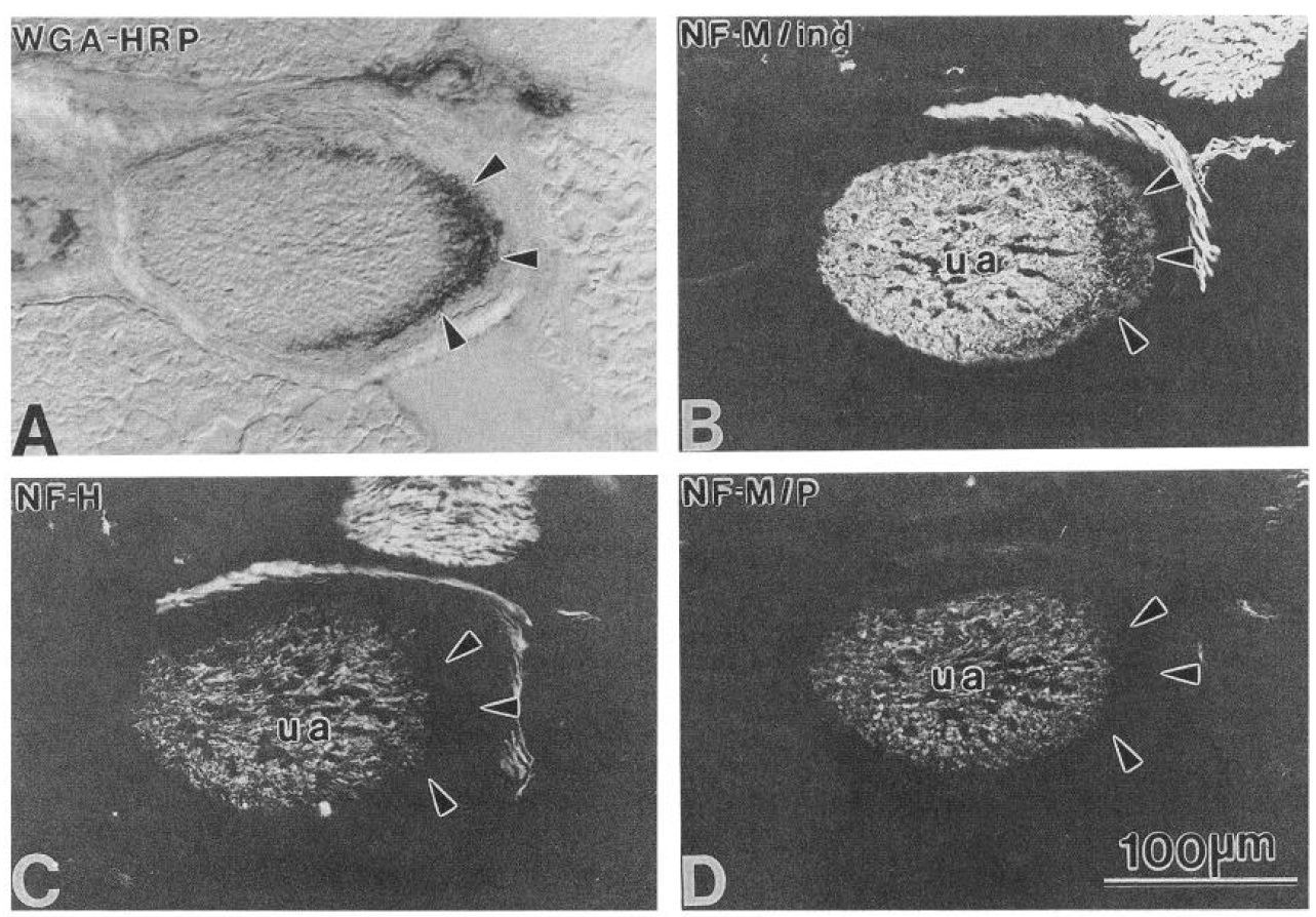 WGA-HRP (A) or by immunofluorescent staining with antibodies directed against various forms of the neurofilament proteins (B-D). The aberrantly