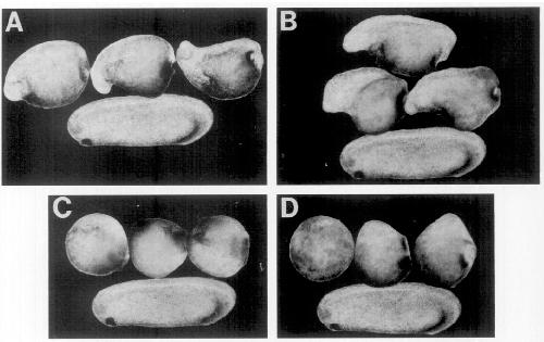 or the two ventral (Band D) blastomeres with 2 ng (A and B) or 4 ng (C and D) of BMP-4 RNA. In each panel, the top three embryos were