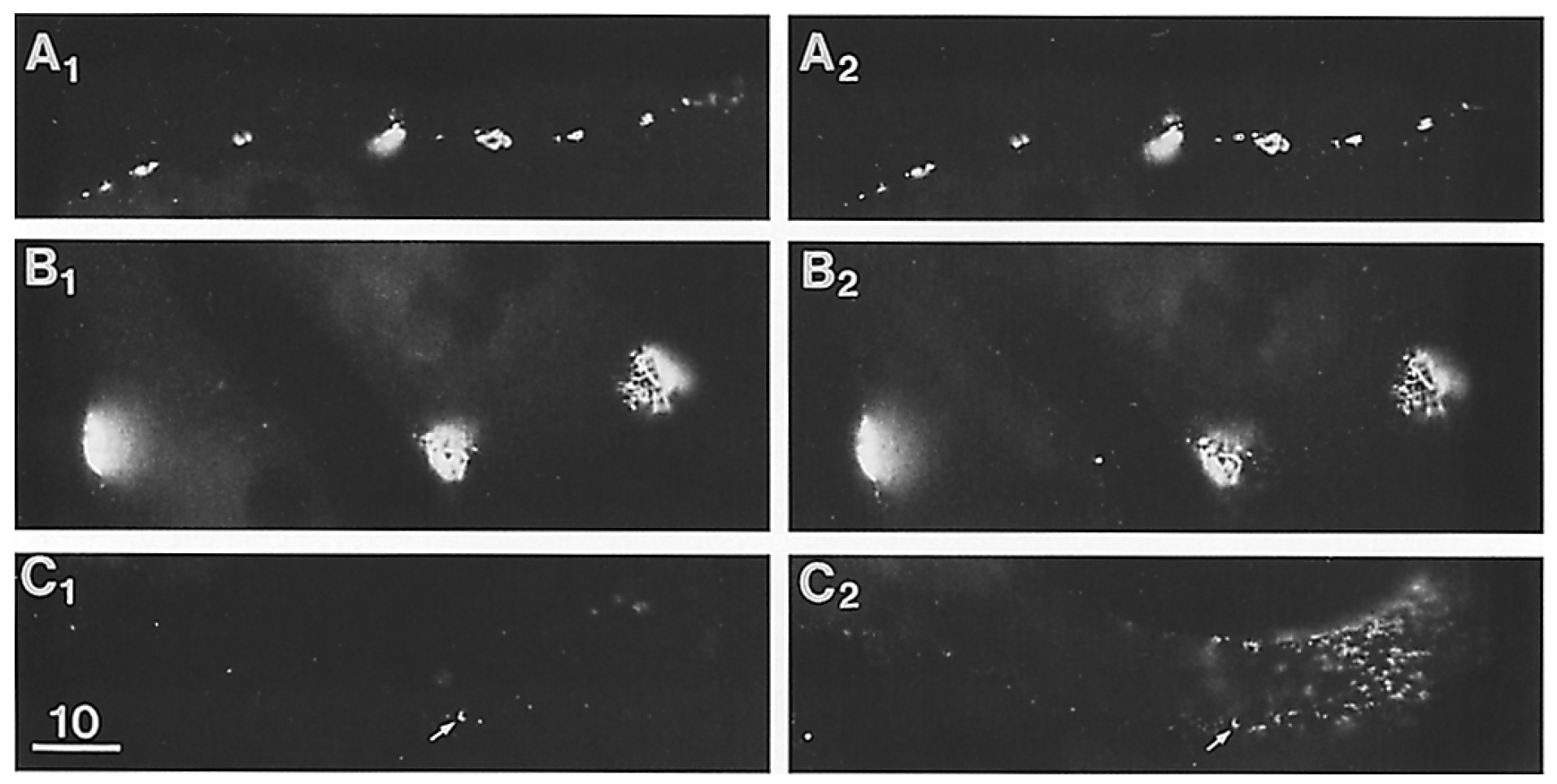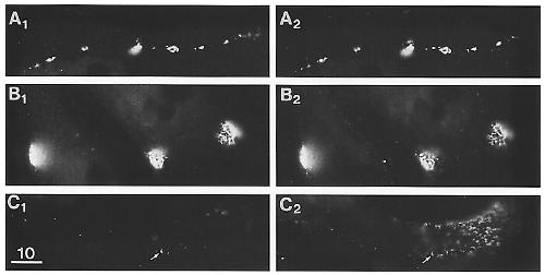 Figure 2. ~xDG immunofluorescence at synaptic and nonsynaptic clusters of AChRs. (At) AChR fluorescence along a neurite-muscle contact.