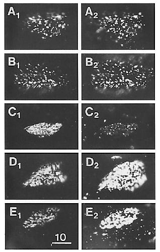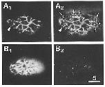(Ae) Corresponding ~xDG immunofluorescence, located at the synaptic clusters of AChRs. (B~) Large clusters of AChRs on noninnervated