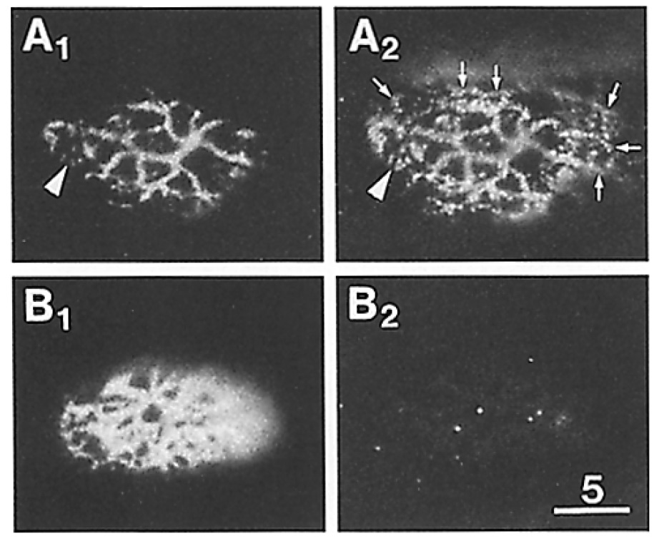to microclusters of colocalized AChRs and t~DG. Arrows point to