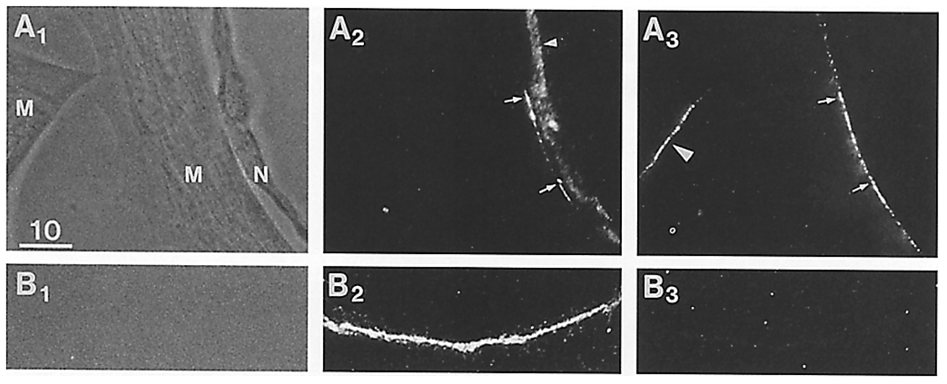 (A3) c~DG immunofluorescence is colocalized with, but more extensive than, the agrin along the neurite-muscle contact (arrows). It is