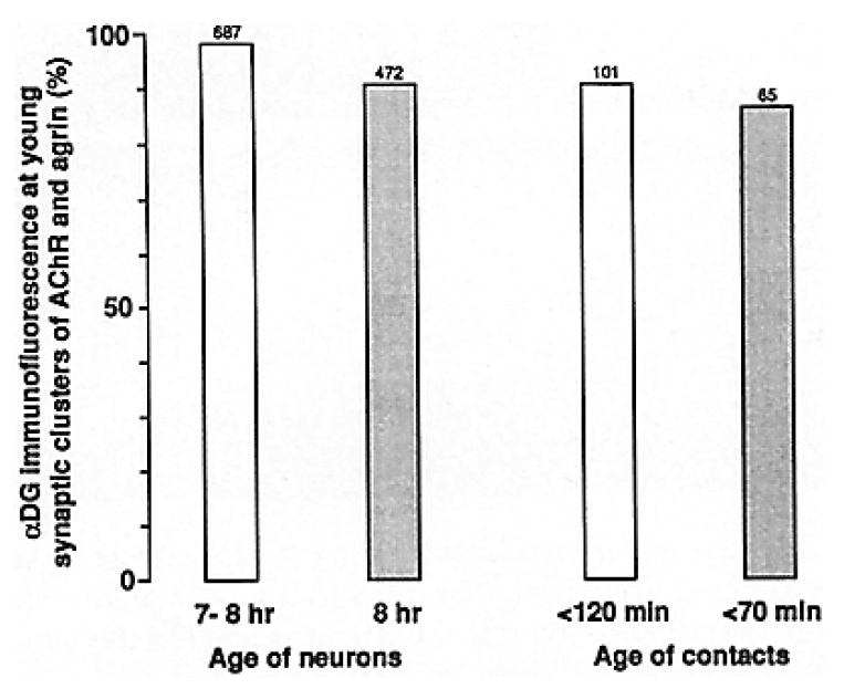 clusters of AChRs (open columns) and agrin (stippled columns).