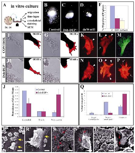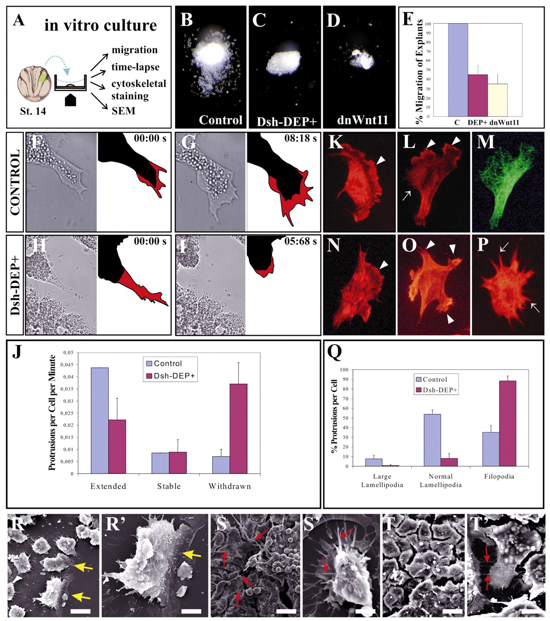 Fig. 7. Analysis of neural crest migration in vitro. (A) Neural crest was dissected from an early neurula and cultured in vitro on fibronectin for several hours. We analyzed migration, cell movement, cytoskeletal staining and cellular morphology. (B) Control neural crest explant, showing normal migration (n=60 explants). (C) Explant taken from an embryo injected with 1 ng of Dsh-DEP+ mRNA. Note the absence of cell migration (n=30 explants). (D) Explant taken from an embryo injected with 2 ng of dnWnt11 mRNA. Note the inhibition of cell migration (n=12 explants). (E) Summary of three independent experiments where the percentage migration was analyzed. One hundred percent of the control explants showed a normal neural crest migration, whereas this process was inhibited in the Dsh-DEP+ and dnWnt11-injected embryos. (F-I) Single time-lapse frames showing representative cell behaviour; right, diagrams of cells with time points. Cell bodies, black; lamellipodia, red. n=8 explants. (F,G) Control cells; (H,I) Dsh-DEP+ injected cells. (J) Protrusive activity. Control cells extend more lamellipodia and Dsh-DEP+ injected cells withdraw more protrusions. (K-Tâ²) Analysis of lamellipodia was performed between 2 and 20 hours after culture, by staining actin with Phalloidin-rhodamine (K,L,N-P) or with an antibody against tubulin (M), or by SEM (R-T). Representative cells are shown for control (K-M) and Dsh-DEP+ injected cells (N-P). (K,N) Representative large lamellipodia. (L,M,O) Representative normal lamellipodia. (M) Tubulin staining for the cell shown in L. (P) Representative cell extending filopodia as its main protrusion. (Q) Types of protrusion. Control cells show large lamellipodia and mainly normal lamellipodia, whereas Dsh-DEP+ injected cells show mainly filopodia. (R,Râ²) Control neural crest; yellow arrow indicates a large lamellipodia at the front of migration. (S,Sâ²) Neural crest injected with Dsh-DEP+; red arrow indicates filopodia. (T,Tâ²) Neural crest injected with dominant-negative Wnt11; red arrow indicates filopodia. Scale bars in R-Tâ²: 10μ m.