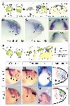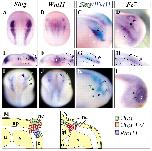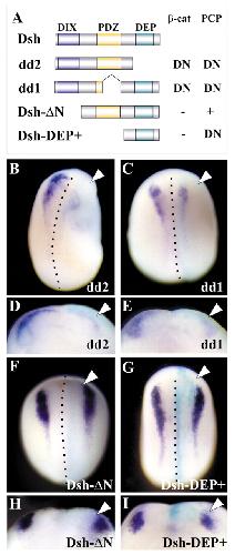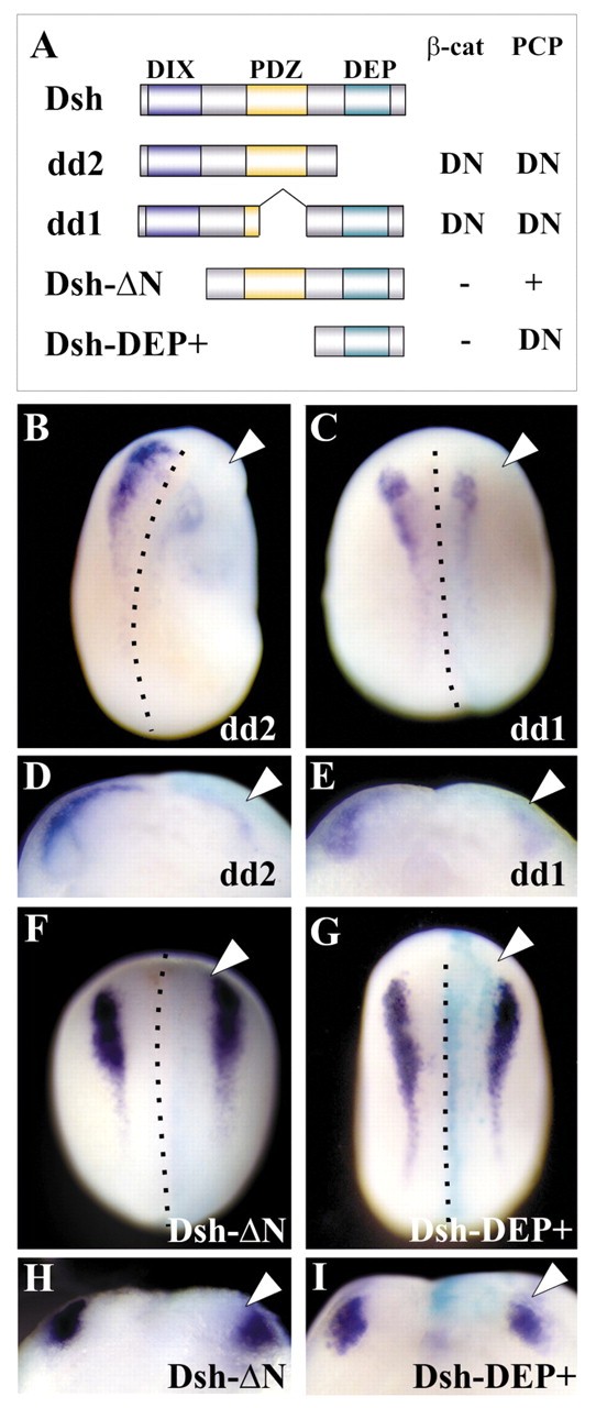 Fig. 1. Neural crest induction is dependent on canonical, but not non-canonical, Wnt signalling. (A) Several dishevelled (Dsh) mutants were used to distinguish between canonical (β-cat) and non-canonical (PCP) Wnt signalling. DN, dominant negative; â, no effect; +, activation. (B-I) mRNA coding for each of these mutants was injected at the two-cell stage into the animal region fated to become ectoderm, the embryos were cultured until the equivalent of stage 17 and the expression of the neural crest marker Slug was analyzed. B,C,F and G are dorsal views; D,E,H and I are sections; anterior is to the top. The injected side (arrowhead) was identified by the lineage marker FDX (pale green). (B,D) Embryo injected with 1 ng of dd2 mRNA. Strong inhibition of the neural crest marker on the injected side is observed (35% of embryos showed inhibition of Slug expression, n=65; embryos with gastrulation defects were not included). (C,E) Embryo injected with 1 ng of dd1 mRNA. Strong inhibition of the neural crest marker on the injected side is observed (37% of embryos showed inhibition of Slug expression, n=85; embryos with gastrulation defects were not included). (F,H) Embryo injected with 1 ng of Dsh-âµN mRNA. Normal expression of the neural crest marker is observed on the injected side. Some embryos exhibited a weak inhibition of the expression of Slug (12% of embryos showed inhibited Slug expression, n=85). (G,I) Embryo injected with 1 ng of Dsh-DEP+ mRNA. No effect on the expression of the neural crest marker is observed (n=55).