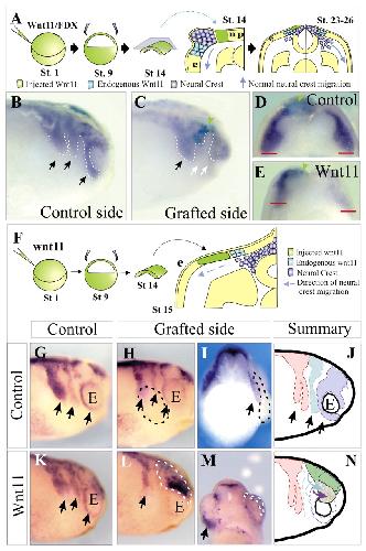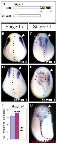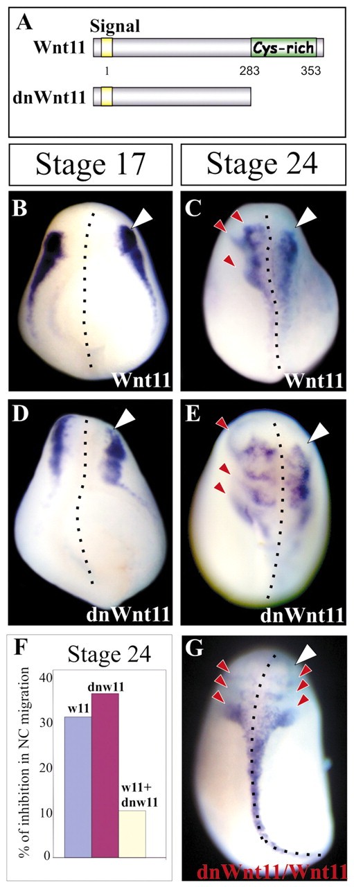 Fig. 4. Wnt11 activity is required for neural crest migration. (A) 1 ng of Wnt11 or 2 ng of its dominant-negative mRNA were injected in one animal blastomere of an eight-cell embryo. (B-G) Embryos were cultured until the premigratory (B,D; indicated as stage 17) or migratory (C,E,G; indicated as stage 24) neural crest stages, when the expression of Slug was analyzed. All of the embryos are shown in dorsal view, anterior to the top. The injected side is indicated by a white arrowhead. Normal neural crest migration is indicated by red arrowheads. (B,C) Wnt11 overexpression. (B) 90% of embryos showed normal Slug expression, n=55. (C) 30% of embryos showed inhibited neural crest migration, n=55. (D,E) Expression of dominant-negative Wnt11. (D) 90% of embryos showed normal Slug expression, n=65. (E) 35% of embryos showed inhibited neural crest migration; n=65. (F) Summary of inhibition of neural crest migration after injecting Wnt11 (w11), dominant-negative Wnt11 (dnw11), or both (w11+dnw11). (G) Co-injection of Wnt11 and its dominant-negative form. 90% of embryos showed normal neural crest migration, n=50.