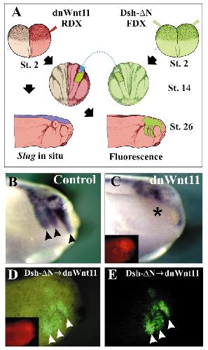 Fig. 6. Inhibition of neural crest migration by dominant-negative Wnt11 is rescued by activated Dsh. (A) Two-cell stage embryos were injected with dnWnt11 mRNA and RDX (red), or with Dsh-âµN and FDX (green). At stage 14, neural crest cells were taken from the Dsh-âµN-injected embryo and grafted into the dnWnt11-injected embryo. Analysis of neural crest migration was performed by examining Slug expression and fluorescence. (B) Control side of embryo injected with dnWnt11. Arrowheads indicate normal neural crest migration. (C) Injected side of the embryo shown in B. Asterisk indicates the absence of neural crest migration. (Inset) RDX fluorescence. (D,E) Graft of Dsh-âµN/FDX-expressing cells into an embryo injected with dnWnt11/RDX. (Inset) RDX fluorescence. Note the normal migration of the FDX-expressing cells. Seventy-five percent of embryos showed rescued neural crest migration; n=20.