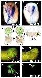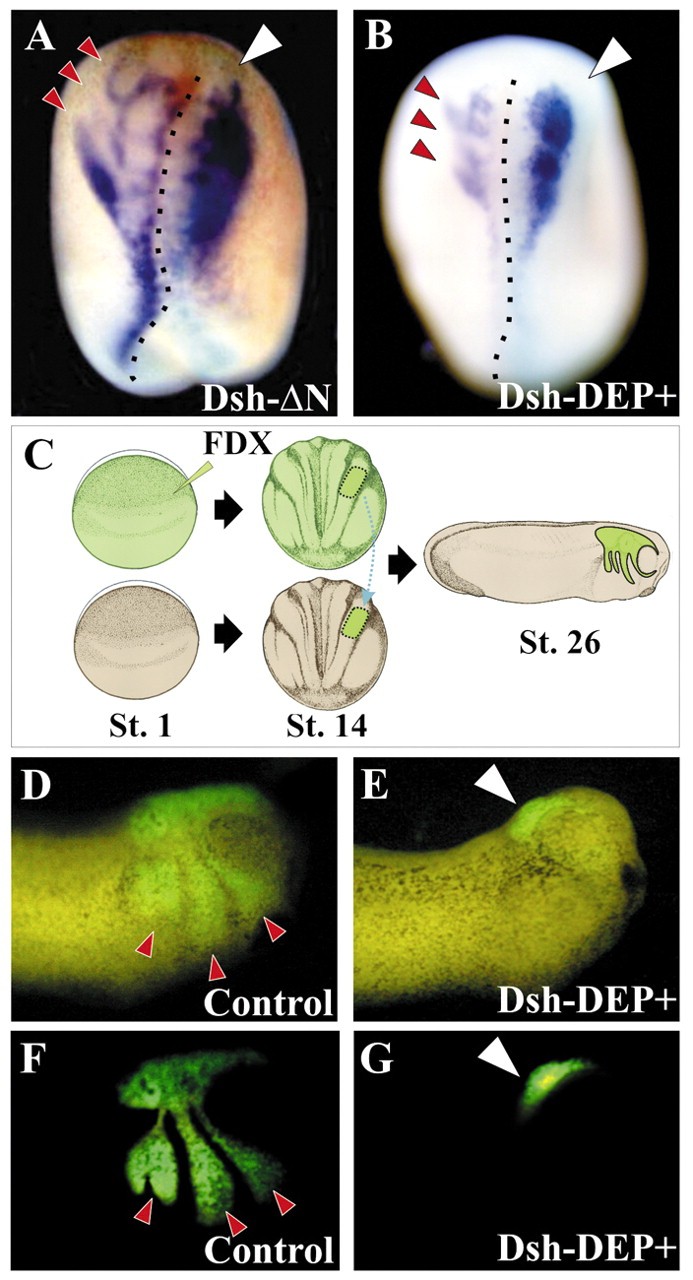 Fig. 2. Neural crest migration is dependent on normal non-canonical Wnt signalling. (A,B) Embryos were injected into the animal blastomeres at the 8-cell stage with 1 ng of mRNA coding for Dsh-âµN (A) or Dsh-DEP+ (B). The embryos were cultured until stage 24, when the expression of the neural crest marker Slug was analyzed at postmigratory stages; the injected side (white arrowhead) was identified by FDX expression (pale green). The uninjected side shows the normal pattern of cephalic neural crest migration, which is indicated by the red arrowheads, each one pointing to the mandibular, hyoid and branchial neural crest, respectively. The injection of Dsh-âµN and Dsh-DEP+ led to a dramatic inhibition of neural crest migration (white arrowhead in A,B; 40%, n=60, and 45%, n=55, of embryos showed inhibition of neural crest migration, respectively). (C) One-cell-stage embryos were injected with mRNA coding for Dsh-DEP+, together with the fluorescent lineage tracer FDX (green). At the early neurula stage, the prospective cephalic neural crest were taken from the injected embryos and grafted into a normal uninjected neurula embryo. The migration of the neural crest was analyzed in vivo by following the fluorescence label until stage 26, when the cephalic neural crest has reached its final destination. (D,F) Control embryo showing the normal pattern of cephalic crest migration; 95% of grafted embryos exhibited normal migration, n=30. (E,G) Embryo grafted with neural crest taken from an embryo expressing Dsh-DEP+. No migration of the neural crest is observed on the operated side. Only 5% of grafted embryos showed normal migration, n=20.