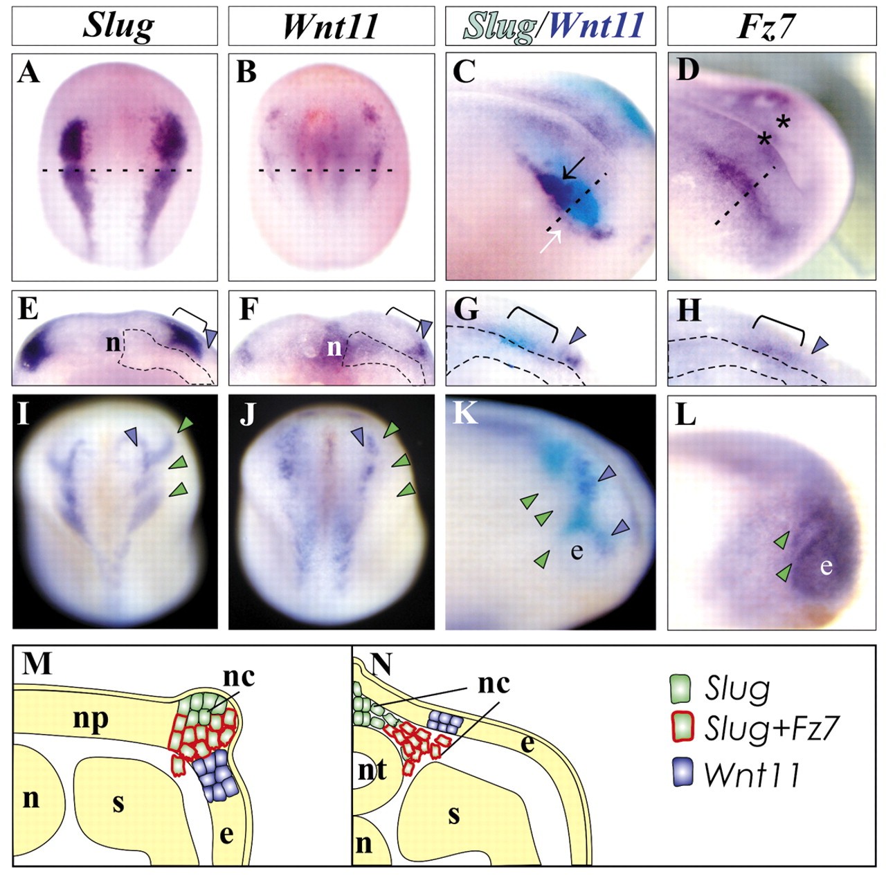 Fig. 3. Wnt11 is expressed adjacent to the migrating neural crest. Simple and double in situ hybridization were performed for the neural crest marker gene Slug, Wnt11 and Fz7, as indicated at the top of the figure. (A-D) Dorsal (A,B) and lateral (C,D) views of stage 16-17 embryos; dashed lines indicate the sections shown in E-H; white arrow, weaker Wnt11 expression; black arrow, stronger Wnt11 expression. (E-H) Sections of the embryos shown in A-D. Purple arrowhead indicates the region where Wnt11 is detected. n, notochord; bracket, region of Slug and Fz7 expression; dashed line marks the endomesoderm. (I-K) Dorsal (I,J) and lateral (K,L) views of stage 23 embryos. e, eye; purple arrowhead indicates the region where Wnt11 is detected; green arrowhead shows the three streams of migrating neural crest. (M,N) Summary of Slug, Fz7 and Wnt11 expression. (M) Premigratory stages. Wnt11 is expressed in the ectoderm adjacent to the neural crest just before migration starts. A subpopulation of the neural crest cells expresses Fz7. (N) Migratory stages. During neural crest migration, Wnt11 is expressed next to the migrating neural crest. np, neural plate; nc, neural crest; s, somite; n, notochord; nt, neural tube; e, epidermis.