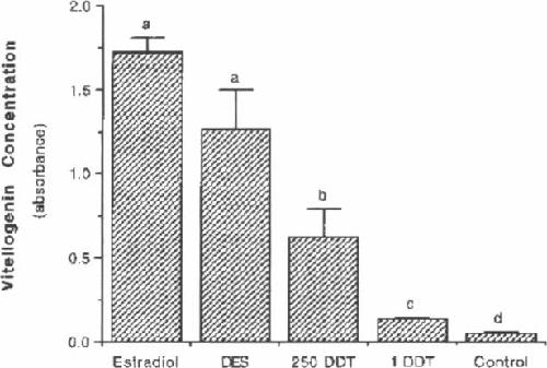 Many environmental pollutants have estrogenic activity in animals. Xenobiotic estrogens include many pesticides and industrial chemicals that biocumulate. The impact of these common pollutants on the reproductive success of wildlife may be considerable, particularly in threatened or endangered species. This research examined the use of plasma vitellogenin in males as a biomarker for estrogenic xenobiotics in reptiles and amphibians. Adult male turtles (Trachemys scripta) and frogs (Xenopus laevis) were given ip injections of estradiol-17 beta (E2), diethylstilbestrol (DES), or o,p'-DDT (1-chloro-2-[2,2,2-trichloro-1-(4-chlorophenyl)ethyl)benzene) daily for 7 days, and plasma was collected on day 14. The estrogenic activity of each compound was determined by measuring the induction of plasma vitellogenin. Vitellogenin was identified by precipitation, electrophoresis, Western blot, and enzyme-linked immunosorbant assay (ELISA). In both species, estradiol and DES treatments induced the most vitellogenin, whereas DDT treatments induced smaller amounts of vitellogenin in a dose-dependent fashion. These data indicate that induction of plasma vitellogenin in males may be a useful biomarker of xenobiotic estrogen activity in wild populations of reptiles and amphibians.