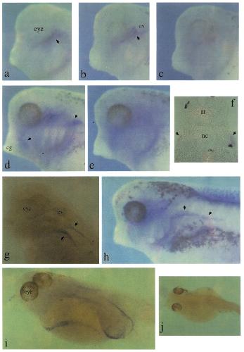 Fig. 6. Whole mount in situ hybridisations showing XKrkI expression in migrating lateral line stem cells. Embryos are albino/wild-type crosses (albino egg, wild-type sperm; these lack maternal pigment but have pigmented melanocytes) except for those in (g), (i) and cj), which are full albinos. Timings given refer to development at 23 deg C. Brown cells are melanocytes; blue indicates positive staining. (a) Stage 31/32 embryo (39 h) hybridised to antisense XKrkl probe, showing staining in a region ventro caudal to the eye. (b) Stage 33/34embryo (44.5 h) hybridised to antisense XKrkl probe, showing staining of lines of cells anterior to the otic vesicle (ov). (c) Stage 33/34embryo hybridised to sense XKrkl probe (control). (d) Stage 35/36 embryo (50 h), showing additional expression in patches adjacent to the cement gland (cg) and posterior to the gill arches (arrowheads). (e) Stage 35/36 sense control. (f) Transverse section through stage 35/36 embryo hybridised to antisense XKrkl probe. nt, neural tube; nc, notochord. Arrowheads indicate blue-staining cell clusters just beneath epidermis. Dark brown cells are melanocytes. (g) cleared stage 37/38 albino embryo (53.5 h) showing expression in bilateral ribbons of cells extending caudally from patch seen in (d). (h) Stage 37/38embryo showing similar expression to that in (g). Diffuse staining around the eye is non-specific. (i) Cleared stage 42 albino embryo (80 h) hybridised to antisense XKrkI probe. Dark- blue cells are positive. (i) Cleared stage 42 albino sense control.