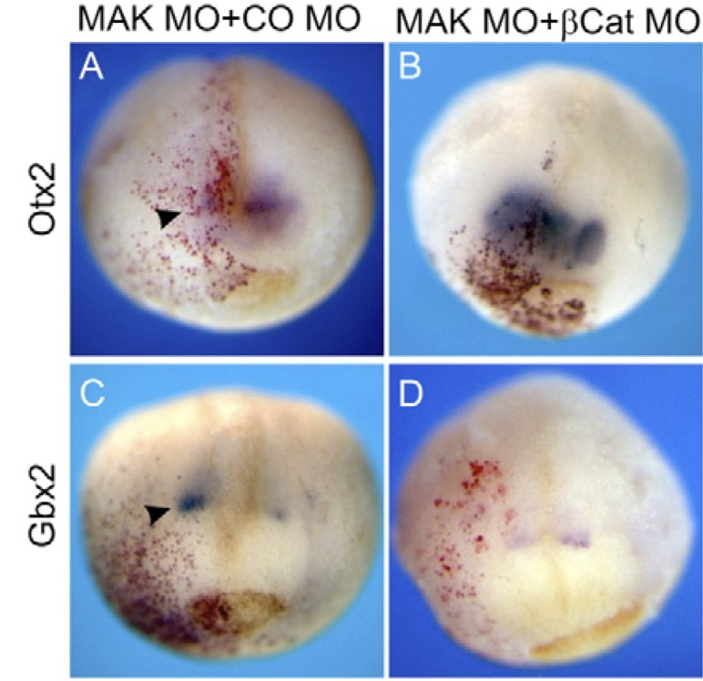 Fig. 8. Depletion of β-catenin restores brain defects caused by MAK (hunk) MO. Embryos were injected with MAK MO (50 ng) and COMO (8 ng, A,C) or β-catenin MO (8 ng, B,D) into one dorsal animal blastomere at the four- to eight-cell stage. Whole-mount in situ hybridization of stage 19 embryos demonstrates that the effects of MAK MO on Otx2 and Gbx2 expression were partially reversed byβ -catenin MO (see also Table 2). Arrowheads in A and C indicate altered marker expression in MAK-depleted embryos. Nuclear βgal RNA served as a lineage tracer. |