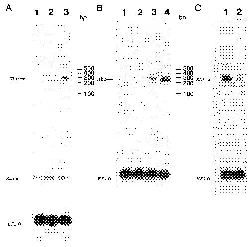 A) Xhh was induced by activin (100 ng/ml), but not bFGF (100 ng/ml). Lane 1, untreated animal cap; lane 2, animal cap treated with b F F (100 ng/ml); lane 3, animal cap treated with activin (100 ng/ml). B) Dose-dependency of t h eexpression of Xhh induced by activin. Lane 1, without treatment: lane 2, activin (1 ng/ml); lane 3, activin (10 ng/ml); lane 4, activin (100 ng/ml). C) Activin induced the expression of Xhh in the animalcap in the presenceor absence of cycloheximide (10 g/ml). Lane 1, with cycloheximide; and lane2 ,without cycloheximide.