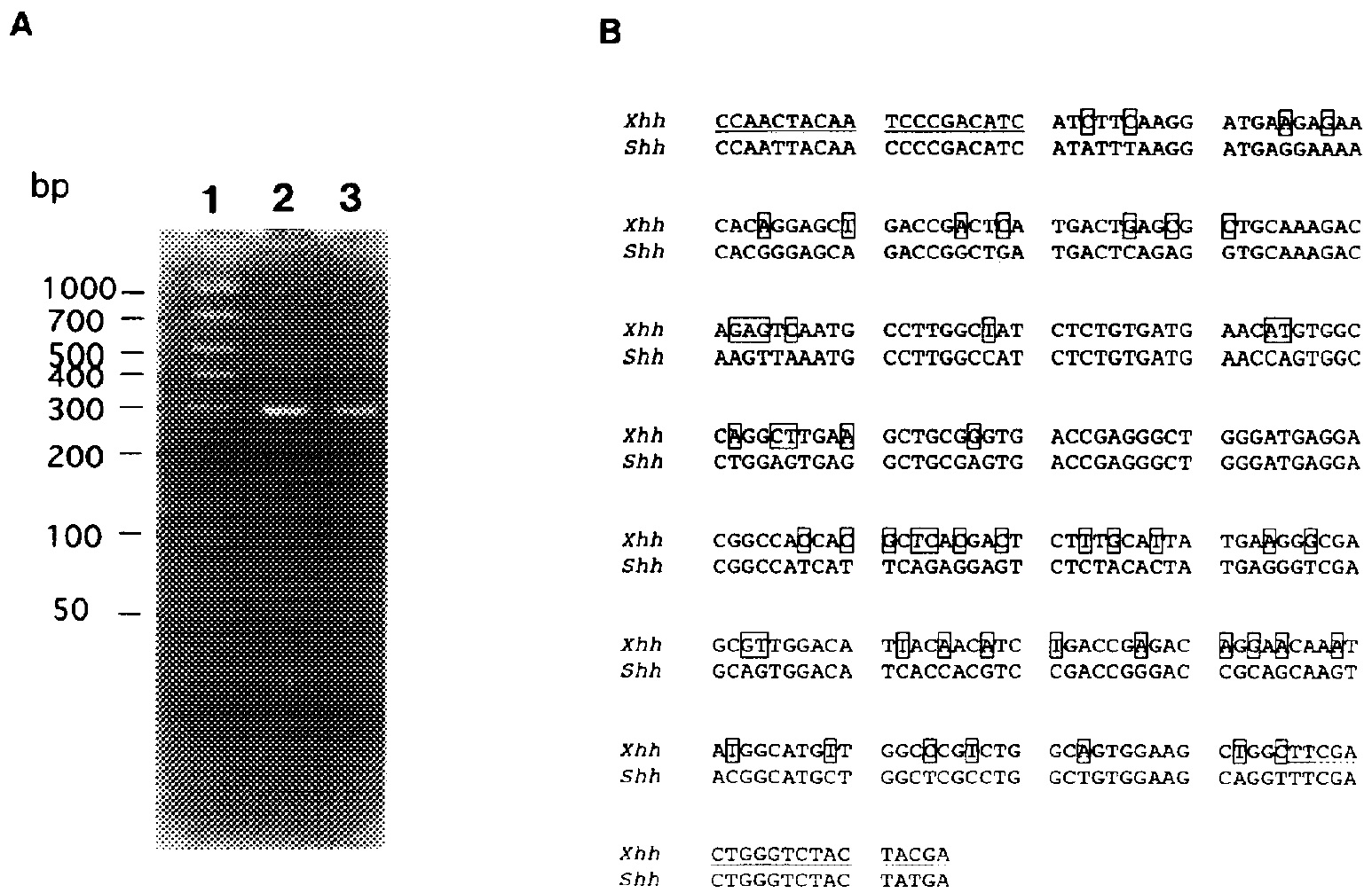 A) The RT-PCR products obtained from the RNA of Xenopusembryos at stages 13 and 31. Lane 1, molecular marker; lane 2, stage 13; and lane 3, stage 31. B) The DNA sequence of the RT-PCR products obtained. The forward and reverse primers used for the RT-PCR are underlined. Nucleotides of the Xhh that are not identical to those of the mouse Shh are indicated by squares. Twenty clones obtained from the embryos at stages 13 and 31 were identical. The same DNA sequence was also observed in six clones of the RT-PCR products obtained from the RNA of theanimal caps treatedwith activin (100 ng/ml).