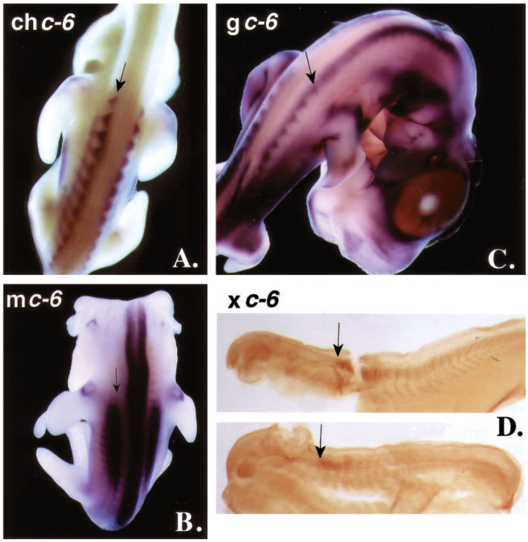anterior limit of gene expression in the paraxial mesoderm. (A) Chick (st. 25) Hoxc-6