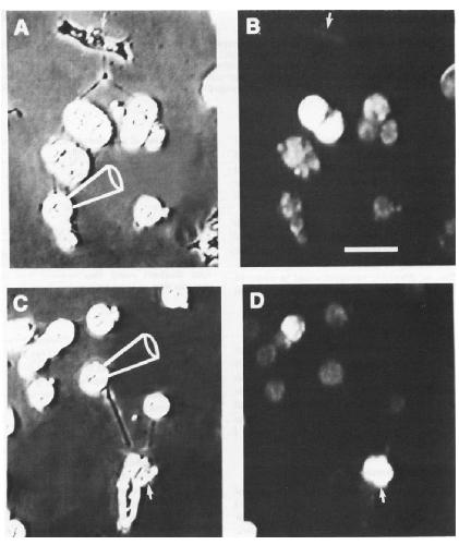 FIG. I. Phase-contrast (A and C) and fluorescence (B and D) micrographs of a Xenc>ppus nerve-muscle culture that contained both synapsin I (-) and (+)