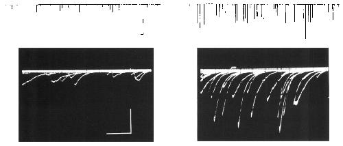 Representative spontaneous synaptic currents in oscilloscope traces at higher time resolution (filtered at 2.5 kHz). Note the increase in frequency and mean