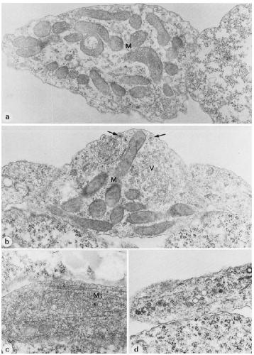 membranes is wider. Basal lamina-like material was not detectable. Mt, microtubules. Arrows indicate large dense-core vesicles. Magnification: a, X24 OOO;