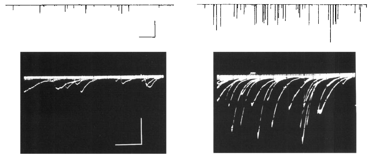Spontaneous synaptic currents of varying amplitudes were observed as downward deflections (clamping voltage = -60 mV, filtered at 150 Hz). (Bottom)