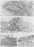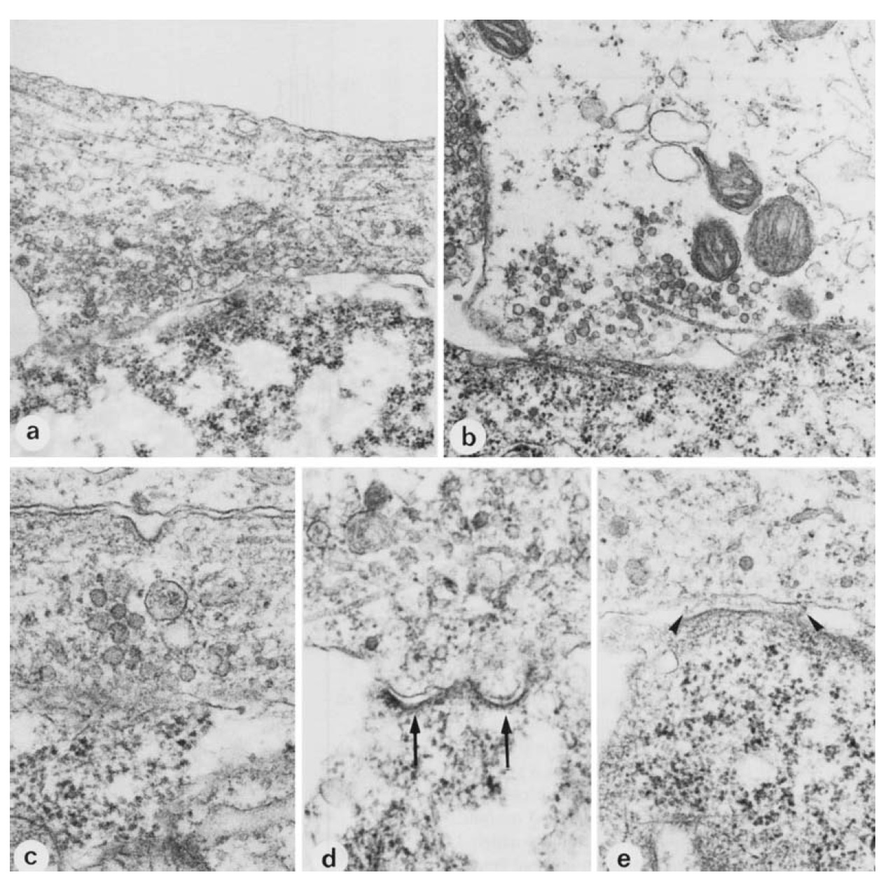 lamina-like material in the cleft (arrowheads in e). Magnification: a and b, X28 OOO; c and d, X50 OOO; e, X40 OOO.