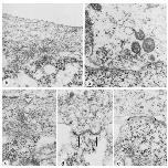 FIG. 5. Electron micrographs of five neuromuscular junctions formed by synapsin I (+) neurons with muscle cells. Note the clustering of synaptic vesicles close